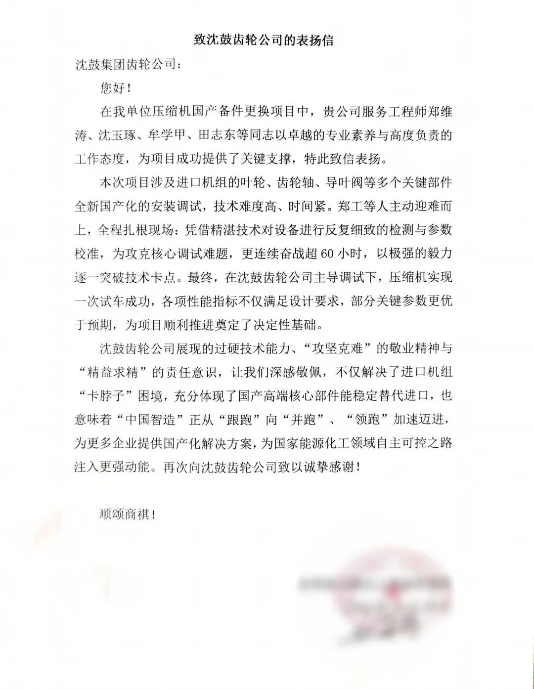 近日,新疆伊犁某用戶向沈鼓集團(tuán)齒輪公司發(fā)來感謝信,盛贊該公司及技術(shù)服務(wù)團(tuán)隊在進(jìn)口壓縮機(jī)國產(chǎn)化改造項目中展現(xiàn)的過硬技術(shù)能力、攻堅克難的敬業(yè)精神與精益求精的責(zé)任意識。信中表示,在我集團(tuán)齒輪公司主導(dǎo)調(diào)試下,壓縮機(jī)實現(xiàn)一次試車成功,各項性能指標(biāo)不僅滿足設(shè)計要求,部分關(guān)鍵參數(shù)更是優(yōu)于預(yù)期,為項目順利推進(jìn)奠定了決定性基礎(chǔ),解決了進(jìn)口機(jī)組“卡脖子”困境,充分體現(xiàn)了國產(chǎn)高端核心部件的硬核實力。